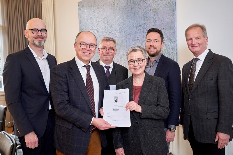 Nach der notariellen Beurkundung: (v.l.) Michael Wermker (Vorstand Valeo-Kliniken GmbH), Frank Böker (Vorsitzender der Geschäftsführung Johanniter GmbH), Pfarrer Reinhard Witt (Kirchenkreis Münster) sowie Superintendentin Kerstin Goldbeck (Kirchenkreis Hamm), Matthias Becker (Geschäftsführer Johanniter GmbH) und Rechtsanwalt Wolfram Friedrichs (Kirchenkreis Münster) (Foto: Andreas Schoelzel)