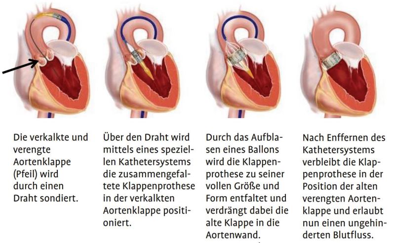 TAVI ist die Abkürzung für „Transcatheter Aortic Valve Implantation". Das heißt, die biologische Herzklappenprothese wird über einen kleinen Zugang mittels Katheter implantiert. Das TAVI-Verfahren wurde für Betroffene mit einer hochgradigen Aortenklappenstenose entwickelt, die einen Herzklappenersatz benötigen, bei denen jedoch das Risiko eines klassischen Aortenklappenersatzes zu hoch ist.