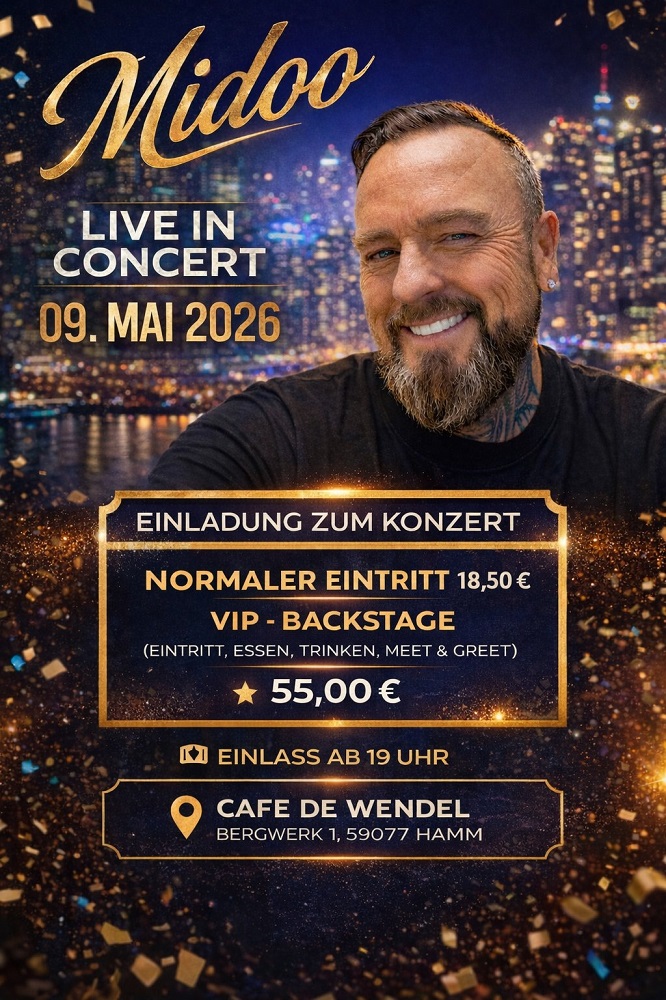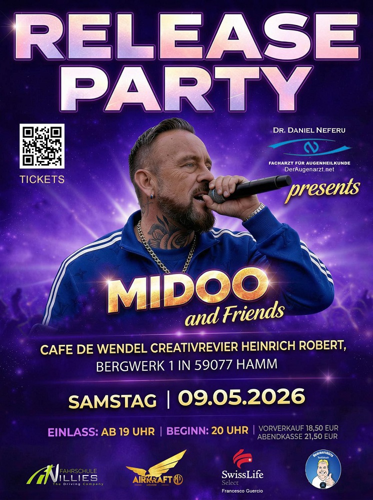 Midoo stellt seine neuen Songs mit einem Konzert im Café de Wendel im CreativRevier Heinrich Robert (Zum Bergwerk 1, 59077 Hamm) im Rahmen einer Release Party unter dem Motto "MIDOO and Friends" am Samstag, 9. Mai 2026, vor.