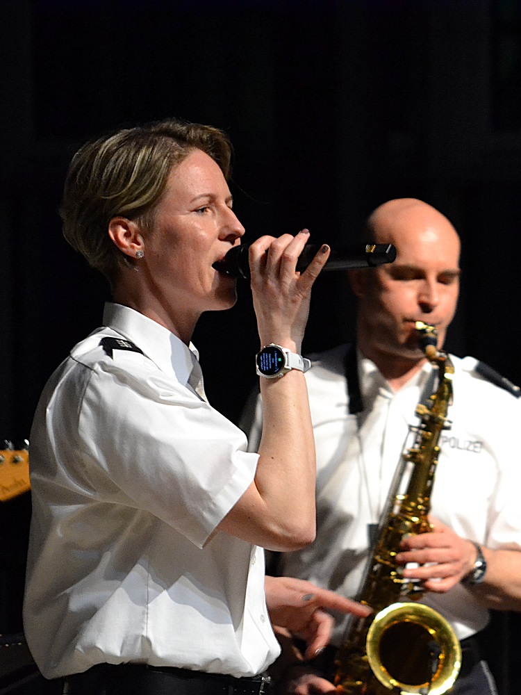 Bemerkenswert, die Profis des Landespolizei-Orchesters mischten sich immer wieder mit ihren Instrumenten unter die Musikklassen. Ein tolles Beispiel für gelungene Zusammenarbeit und echte musikalische Begegnung auf Augenhöhe. LPO-Sängerin Nadine Vinnenberg sang sogar mit Musiklehrer Markus Breuer "Seven Nation Army" im Duett.