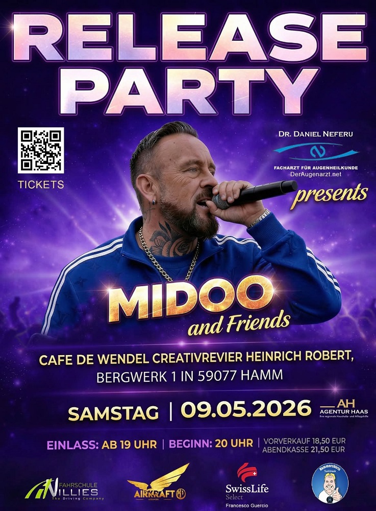 Midoo stellt seine neuen Songs mit einem Konzert im Café de Wendel im CreativRevier Heinrich Robert (Zum Bergwerk 1, 59077 Hamm) im Rahmen einer Release Party unter dem Motto "MIDOO and Friends" am Samstag, 9. Mai 2026, vor.